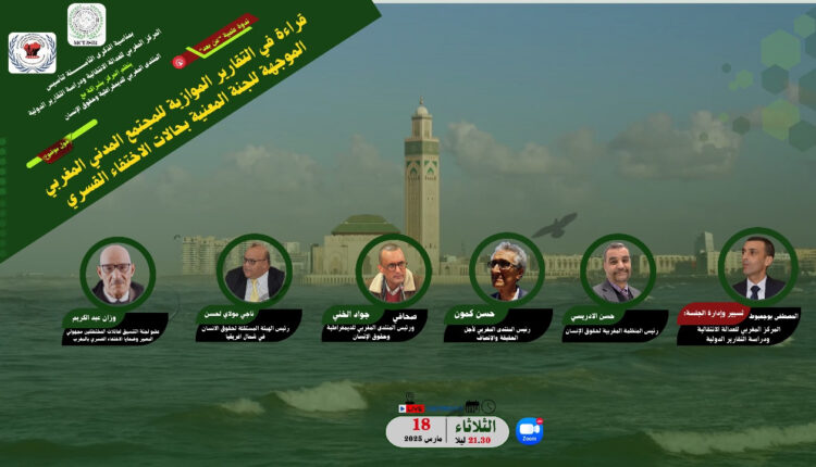 بمناسبة الذكرى الثامــنة لتأسيس المركز المغربي للعدالة الانتقالية ودراسة التقارير الدولية، نظم المركز بشراكة مع المنتدى المغربي للديمقراطية وحقوق الانسان ندوة علمية عن بعد حول موضوع: قراءة في التقارير الموازية للمجتمع المدني المغربي الموجهة للجنة المعنية بالاختفاء القسري، وذلك يوم الثلاثاء 18 مارس 2025 على الساعة 21.30.